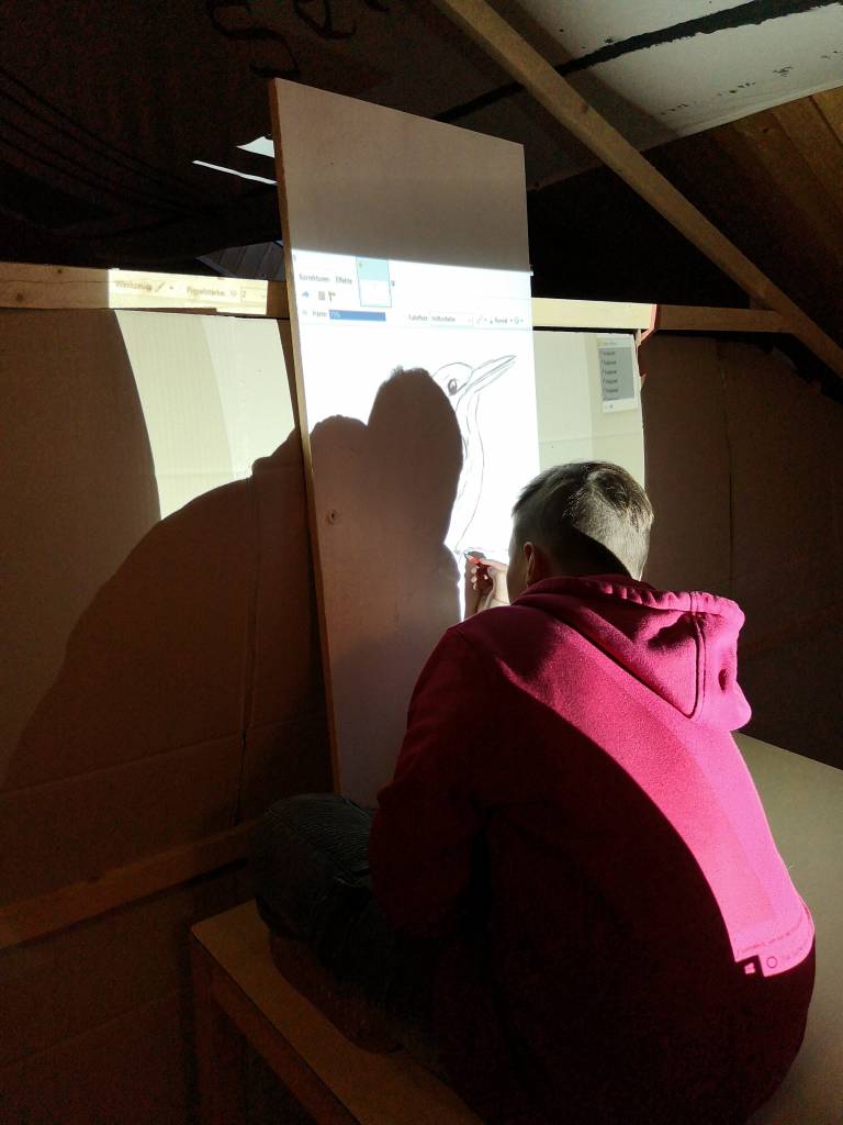Am vergangenen Mittwoch begannen die Eisvögel endlich ihr Sippenfach anzumalen. Dazu wurde erst mit einem Beamer ein Eisvogel auf das Fach proeziert, der dann abgezeichnet wurde.