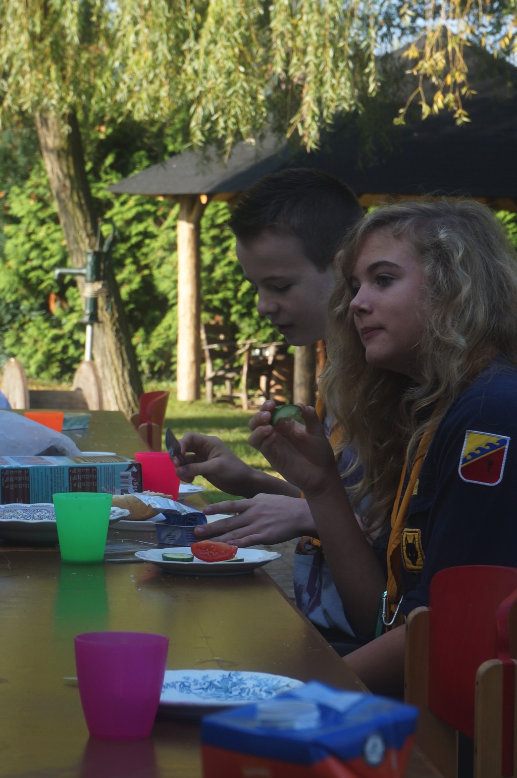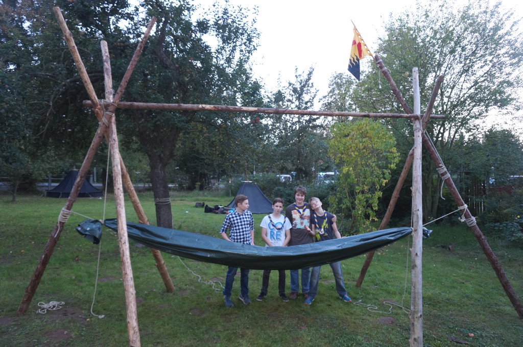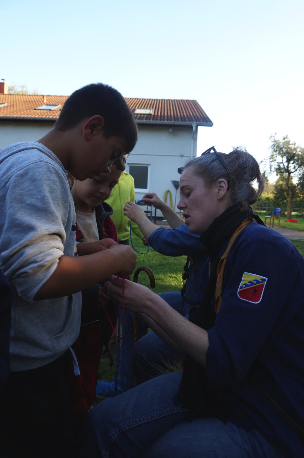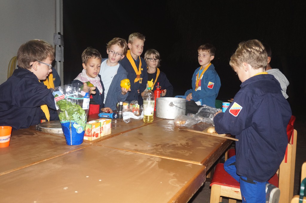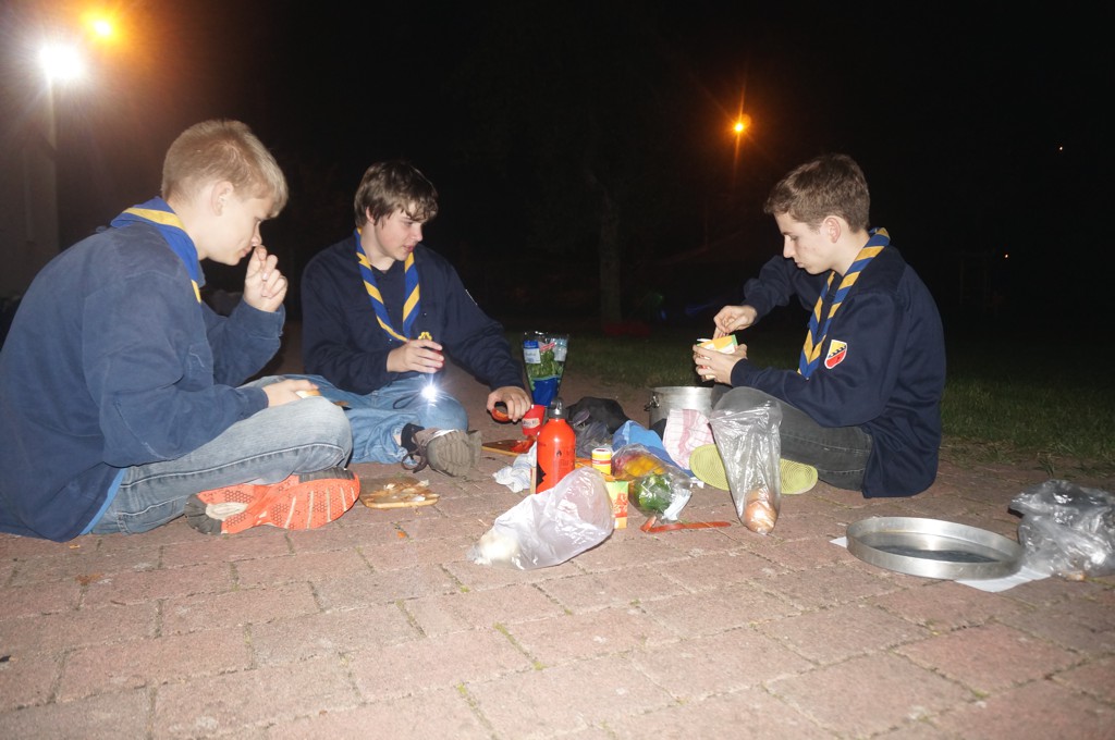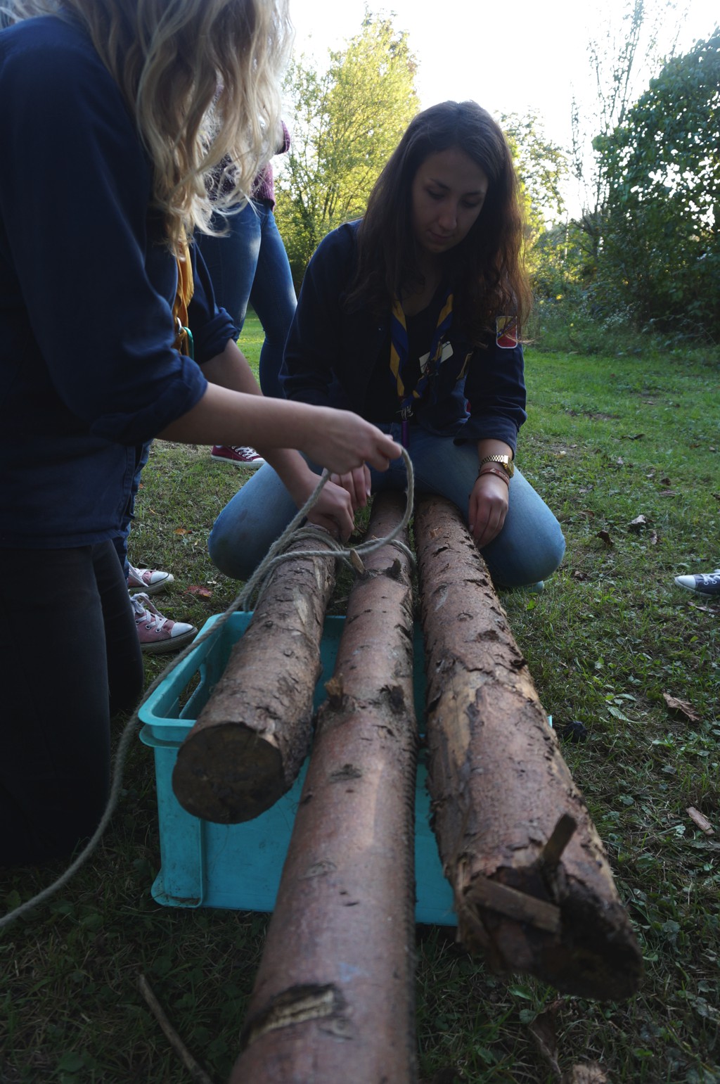 Natürlich wollten wir uns aber nicht so ohne Weiteres von unserem geliebten Statussymbol trennen, und so mussten die Mädels und Jungs in vielen verschiedenen Pfadfinderdisziplinen ihr Können unter Beweis stellen, immer unter unseren strengen Blicken (zumindest wenn wir unsere Sehhilfen nicht wieder irgendwo verlegt hatten). Die Gruppen hatten unter anderem die Aufgabe, sich bei einem Postenlauf in Wilhelmsbad die Zutaten für eine Tomatensoße zu erspielen, die sie dann auch gleich selbst zubereiten und uns kredenzen durften. Außerdem wurden ihre Kenntnisse in Erster Hilfe und Pfadfindertechnik gefordert, kreative Lagerbauten mussten aufgerichtet werden, es gab einen kniffligen Fragebogen rund um den Stamm und das große Stammesheim und, und, und… Zwei Tage lang jagte eine Aufgabe die andere.