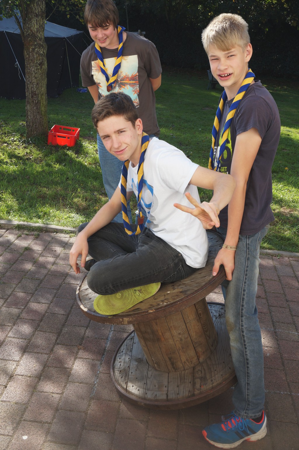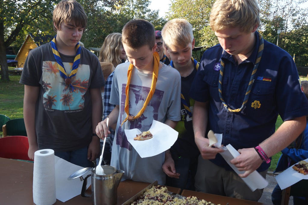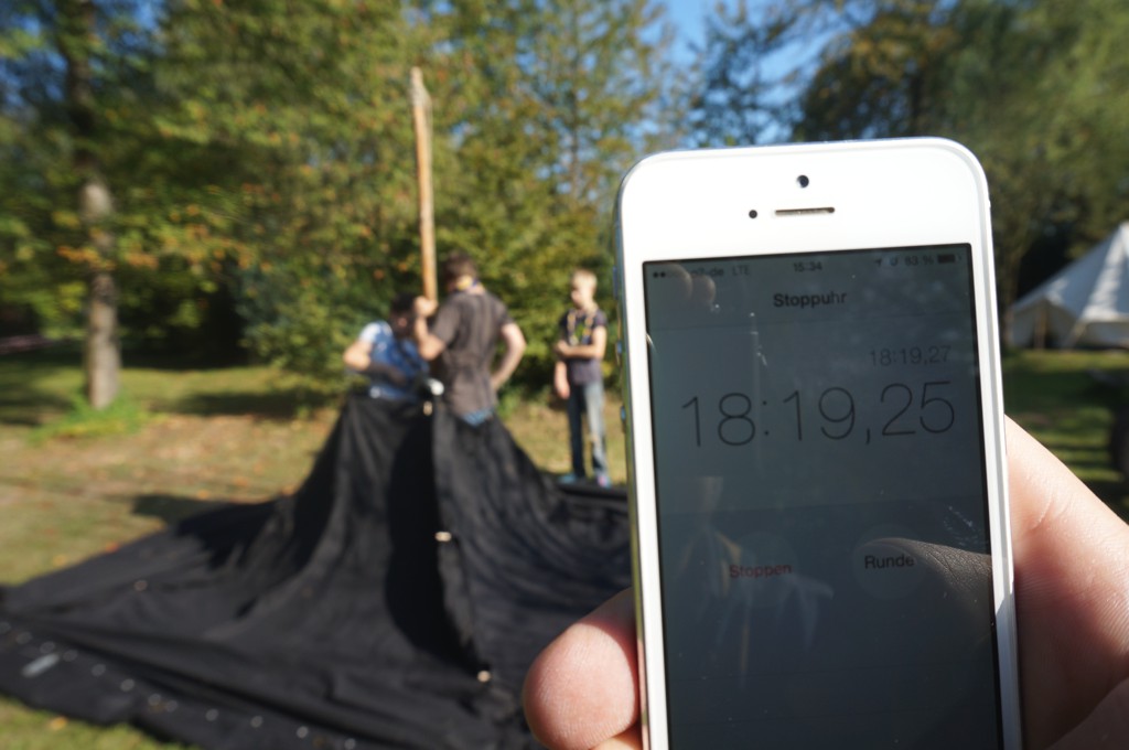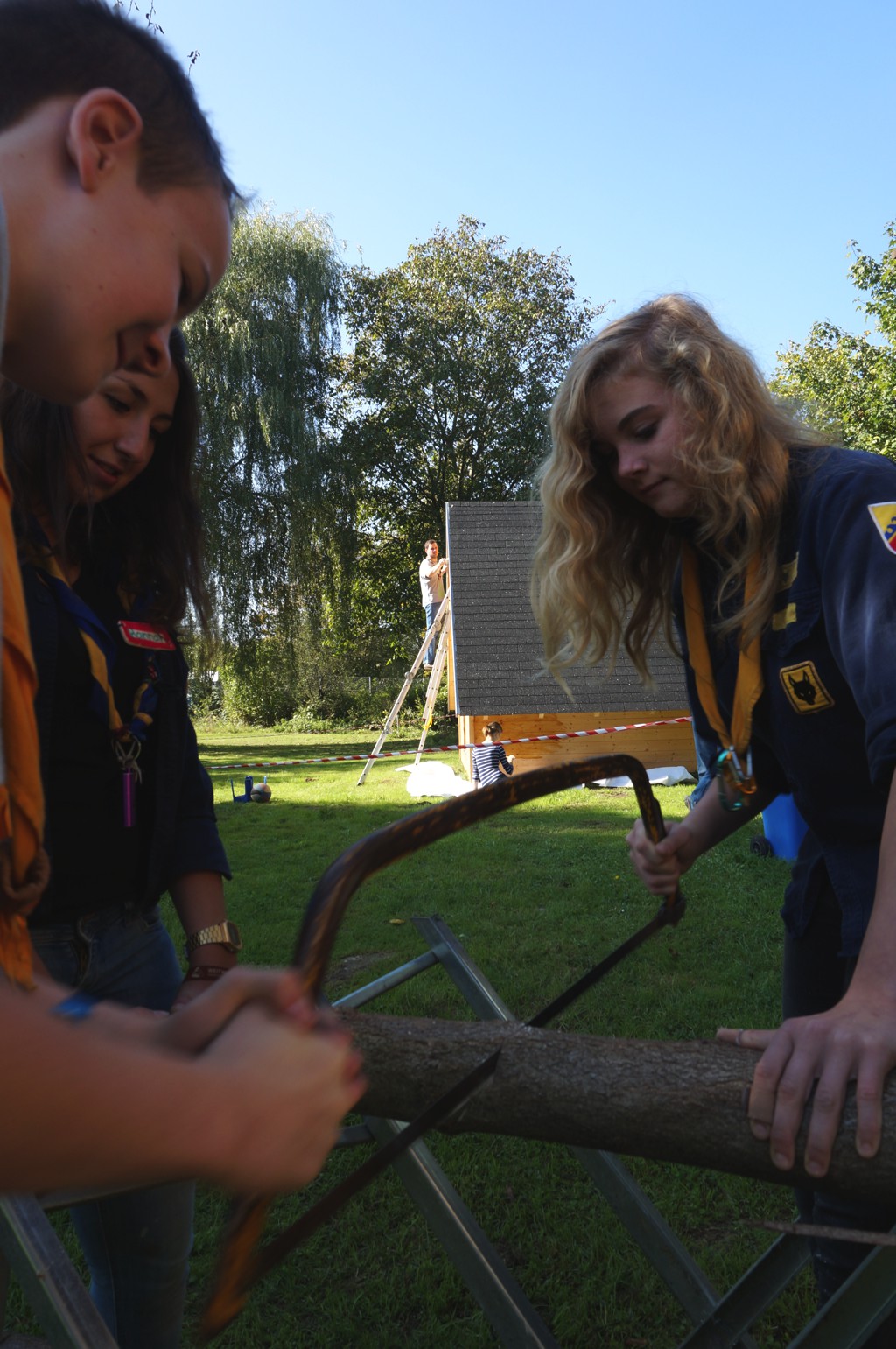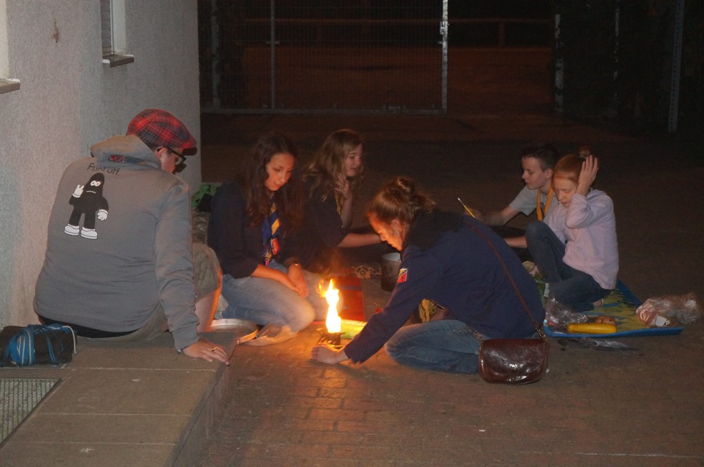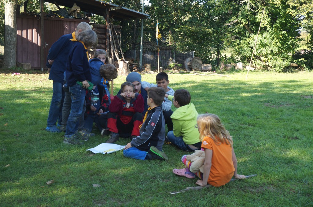 Natürlich wollten wir uns aber nicht so ohne Weiteres von unserem geliebten Statussymbol trennen, und so mussten die Mädels und Jungs in vielen verschiedenen Pfadfinderdisziplinen ihr Können unter Beweis stellen, immer unter unseren strengen Blicken (zumindest wenn wir unsere Sehhilfen nicht wieder irgendwo verlegt hatten). Die Gruppen hatten unter anderem die Aufgabe, sich bei einem Postenlauf in Wilhelmsbad die Zutaten für eine Tomatensoße zu erspielen, die sie dann auch gleich selbst zubereiten und uns kredenzen durften. Außerdem wurden ihre Kenntnisse in Erster Hilfe und Pfadfindertechnik gefordert, kreative Lagerbauten mussten aufgerichtet werden, es gab einen kniffligen Fragebogen rund um den Stamm und das große Stammesheim und, und, und… Zwei Tage lang jagte eine Aufgabe die andere.