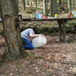 Samstagmorgensein lauter Schrei: „Morgenruuuunde“ schallte es durch den Wald. Nach schnellem Verzehr kamen alle Teilnehmer zusammen und wurden in zwei Räubergruppen aufgeteilt. So gingen beide Gruppen los, um zum ersten Ausbildungsposten zu gelangen. So schnell wie möglich Wasser(anstatt Wasser das eigentliche Gold) befördern, egal wie, nur keine Gegenstände durfte man benutzen. Der erste Posten wurde so beschrieben und auch durchgeführt. Beim Nächsten durfte man mit zwei weiteren Räubern aus der Gruppe an Seilen an den Beinen festgebunden einen Hindernislauf durchführen, auch dies wurde meisterlich bewältigt. Beim Toten Posten durfte man seinen Ideen freien Lauf lassen. So wurden aus Stöcken und Seil mit Blättern schöne Skulpturen, aber auch andere sinnvolle Ideen umgesetzt. Nachdem uns eine weitere, aber am Tage, schaurige Geschichte über einen Mann alleine im Wald erzählt wurde, kamen die Sinnesorgane zum Einsatz. Nachdem wir auch den letzten Posten, welcher daraus bestand, etwas zu malen und zu erraten, nach mehr als 3 Stunden Ausbildungslauf bewältigt hatten, ging es für ein kleines Mittagessen am Nachmittag zum Lagergrund.